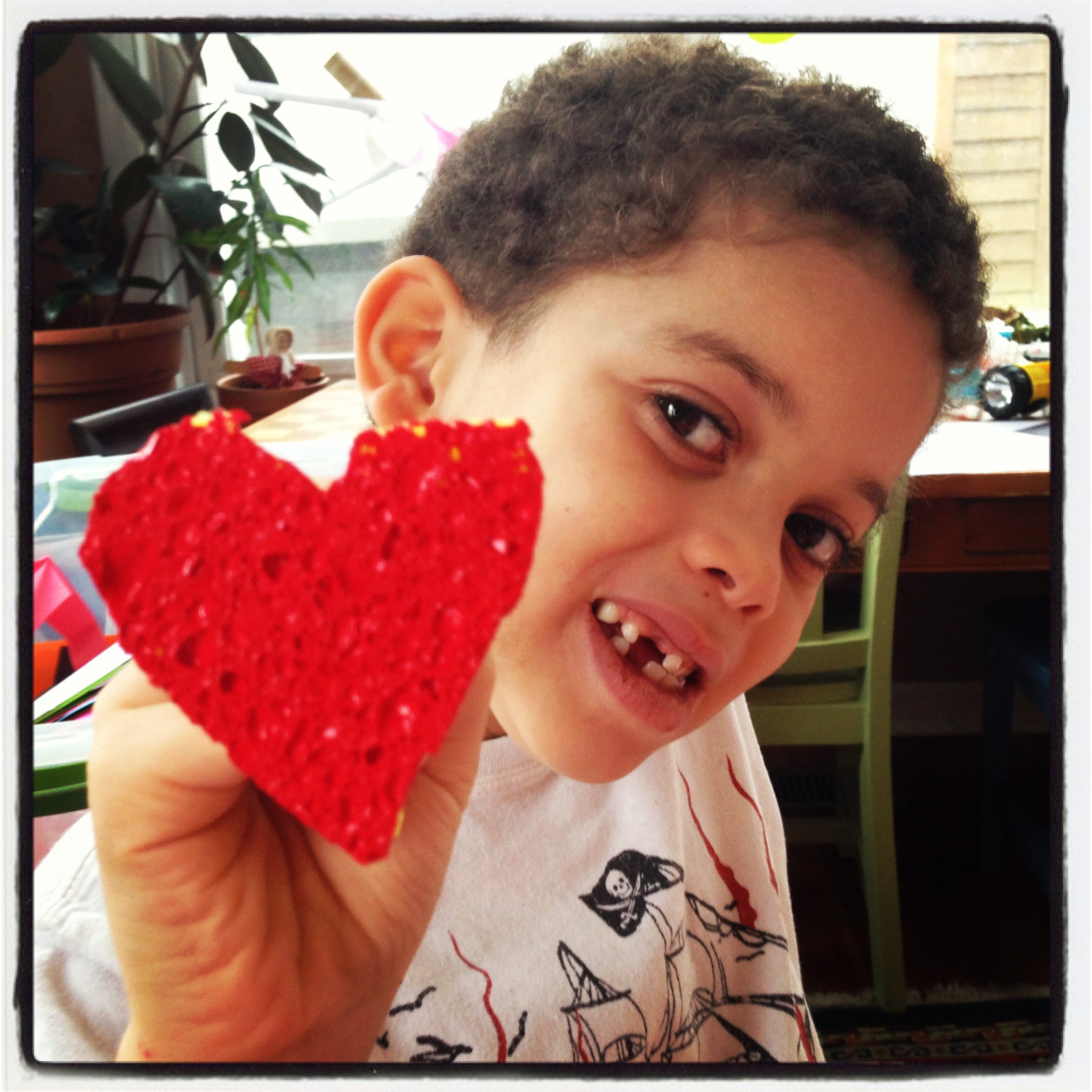 We got the idea from one of my favorite blogs Boy Mama Teacher Mama.  We cut out sponges in the shape of hearts and hot glued the extra pieces of sponge to the back of the hearts to use as “handles”.  Of course Isaiah preferred the hot glue part.  He got a little lost in making spider webs out of hot glue while I prepared our craft area.